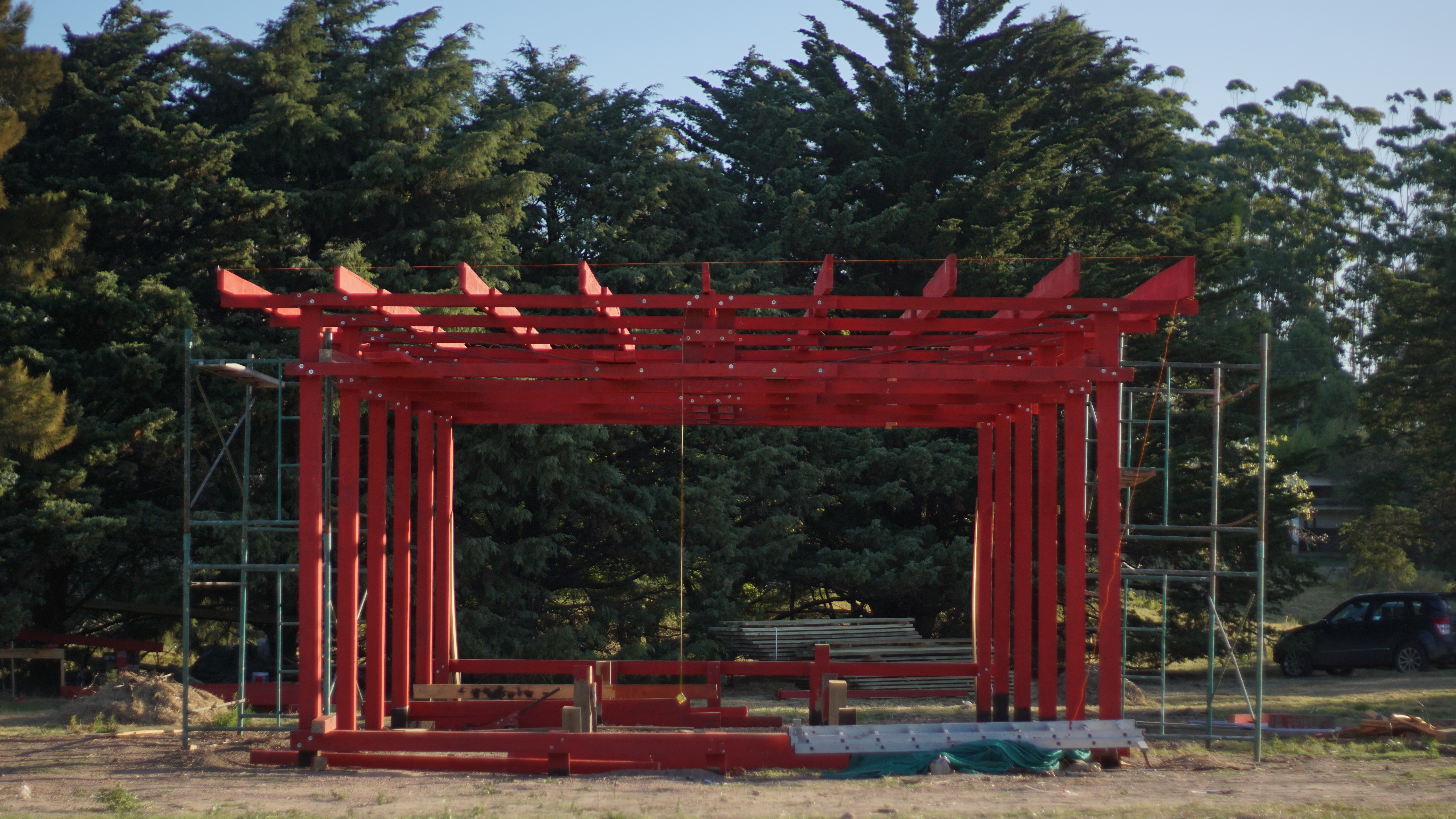Más adelante en el tiempo, en la segunda etapa, se añade el encargo de un programa acondicionado que, como refugio, incluye un gran espacio polivalente con servicios básicos de baño y cocina. Se lleva adelante una estructura de paneles de madera prefabricados que definen un volumen rectangular apoyado en la plataforma roja. Los laterales más extensos y perpendiculares a los pórticos son revestidos en chapa, y en algunos puntos el revestimiento toma el material del policarbonato para permitir mayor ingreso de luz, y mantener una relación con el entorno.
